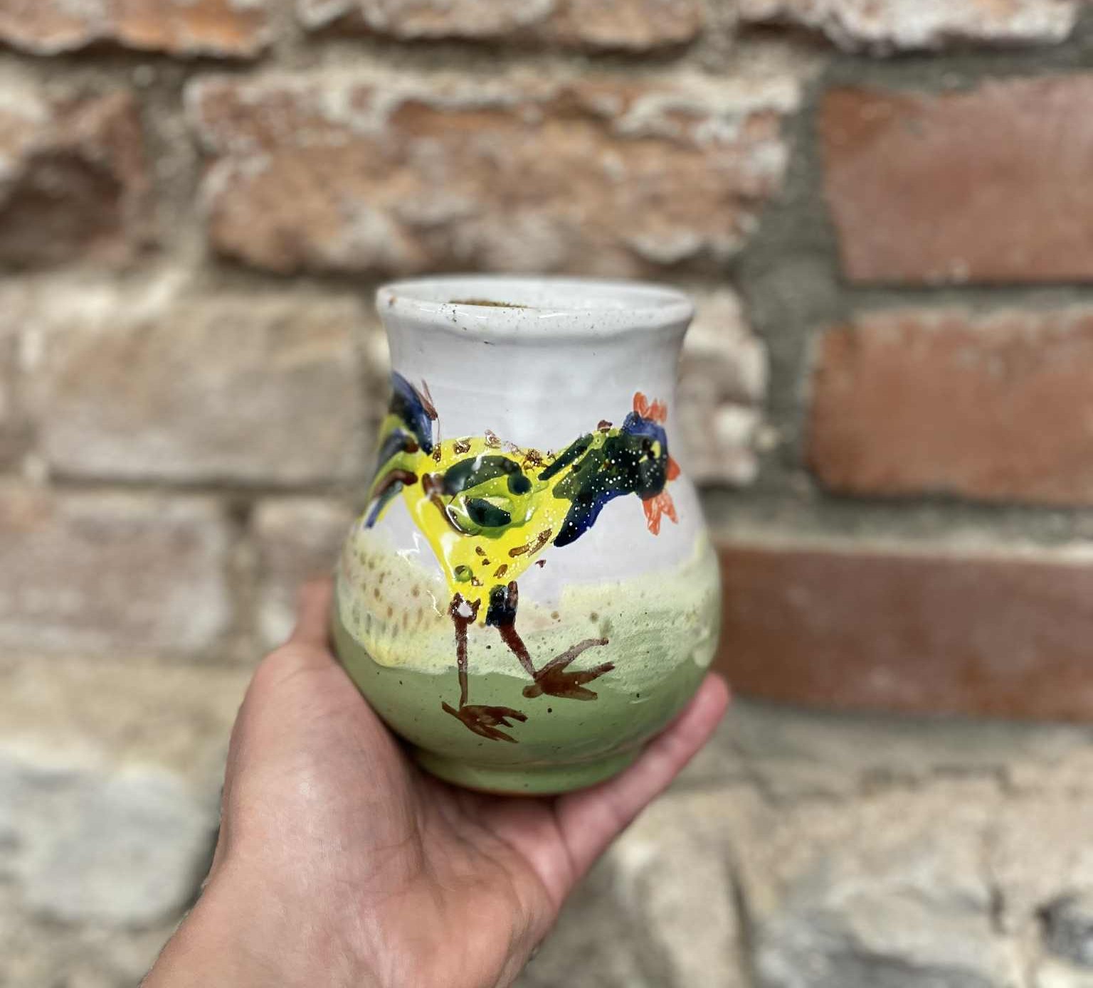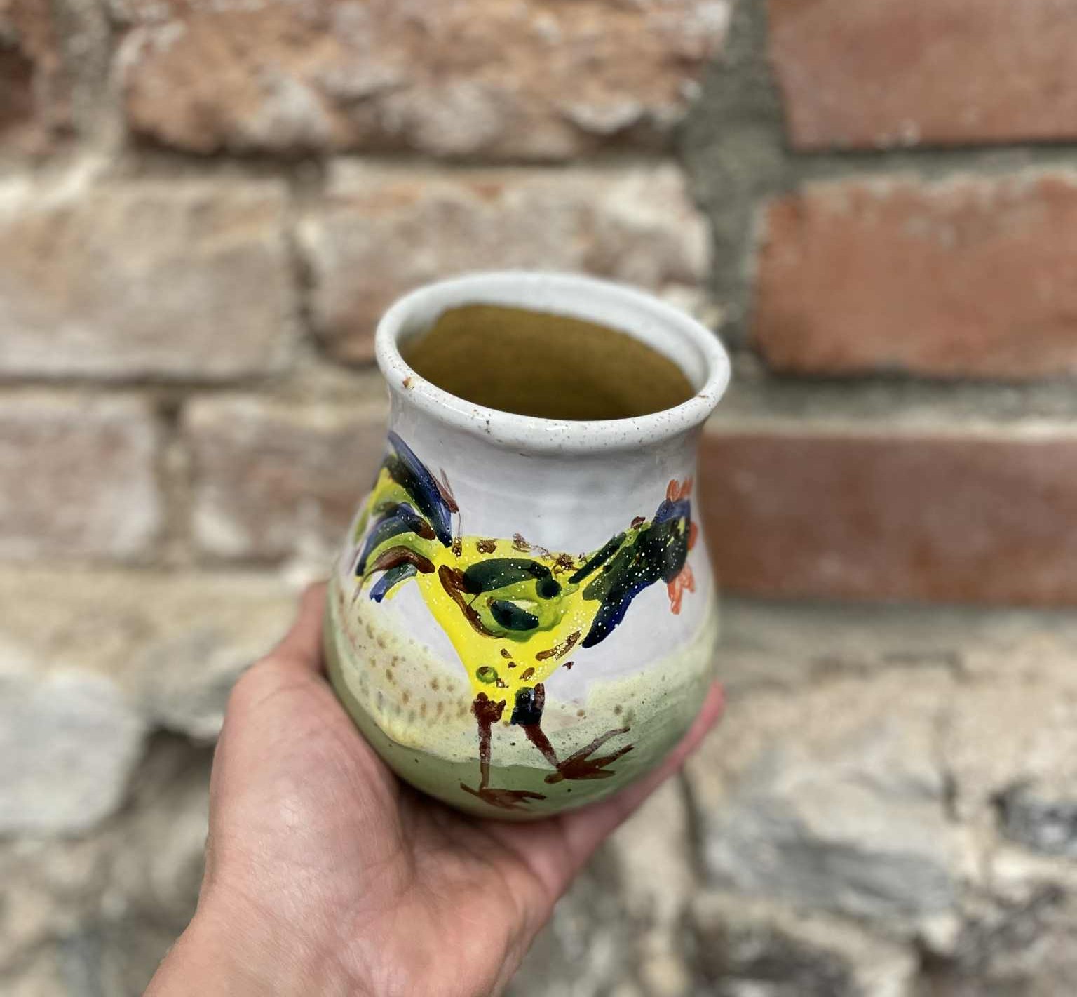 Rankų darbo piešinys, vidus glazūruotas garstyčių spalvos glazūra, tinkančia sąlyčiui su maistu.