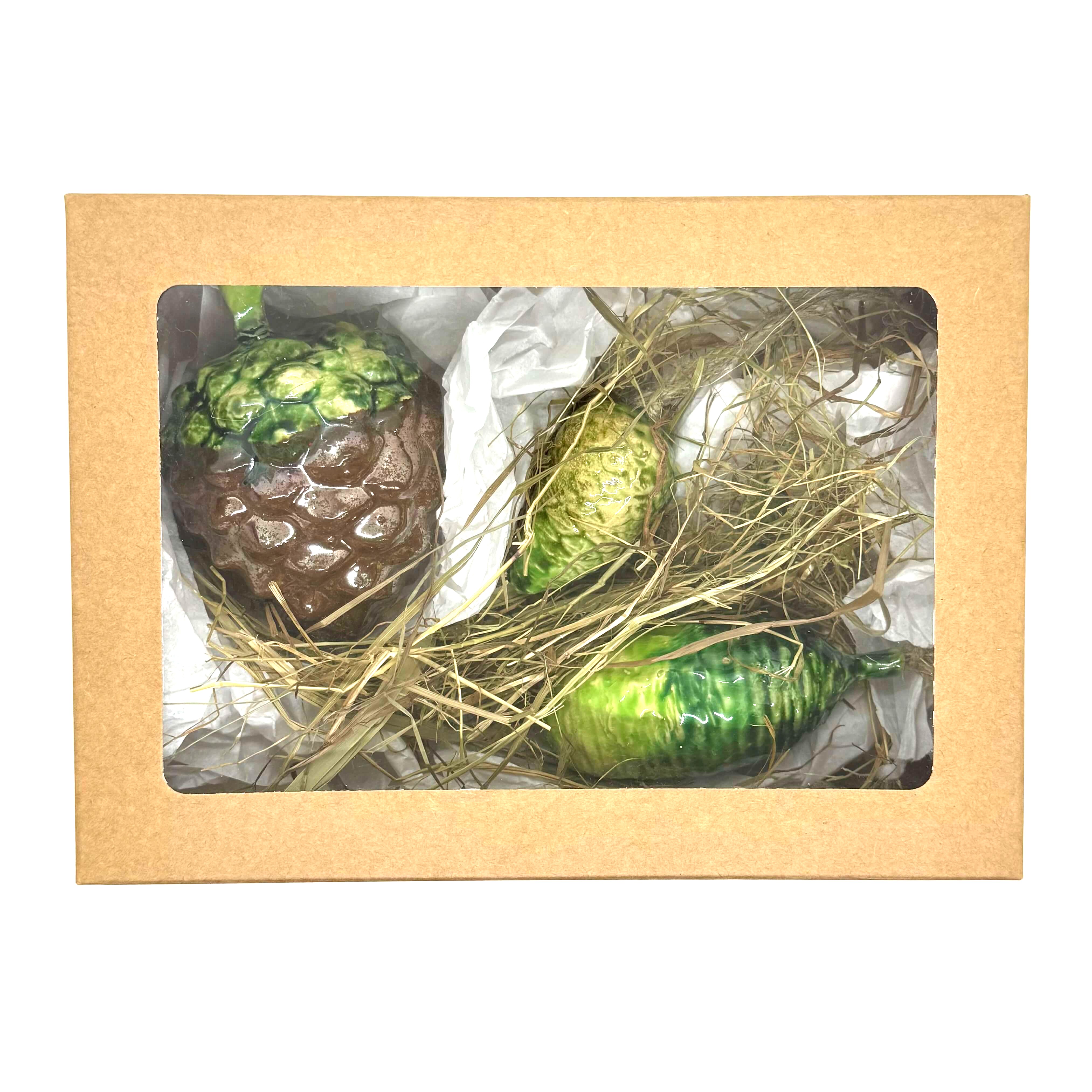 Kiekvienas dirbinys turi pakabinimo kilputę, tuščiaviduriai. Supakuota dėžutėje. Rinkinį sudaro 3 vnt.
