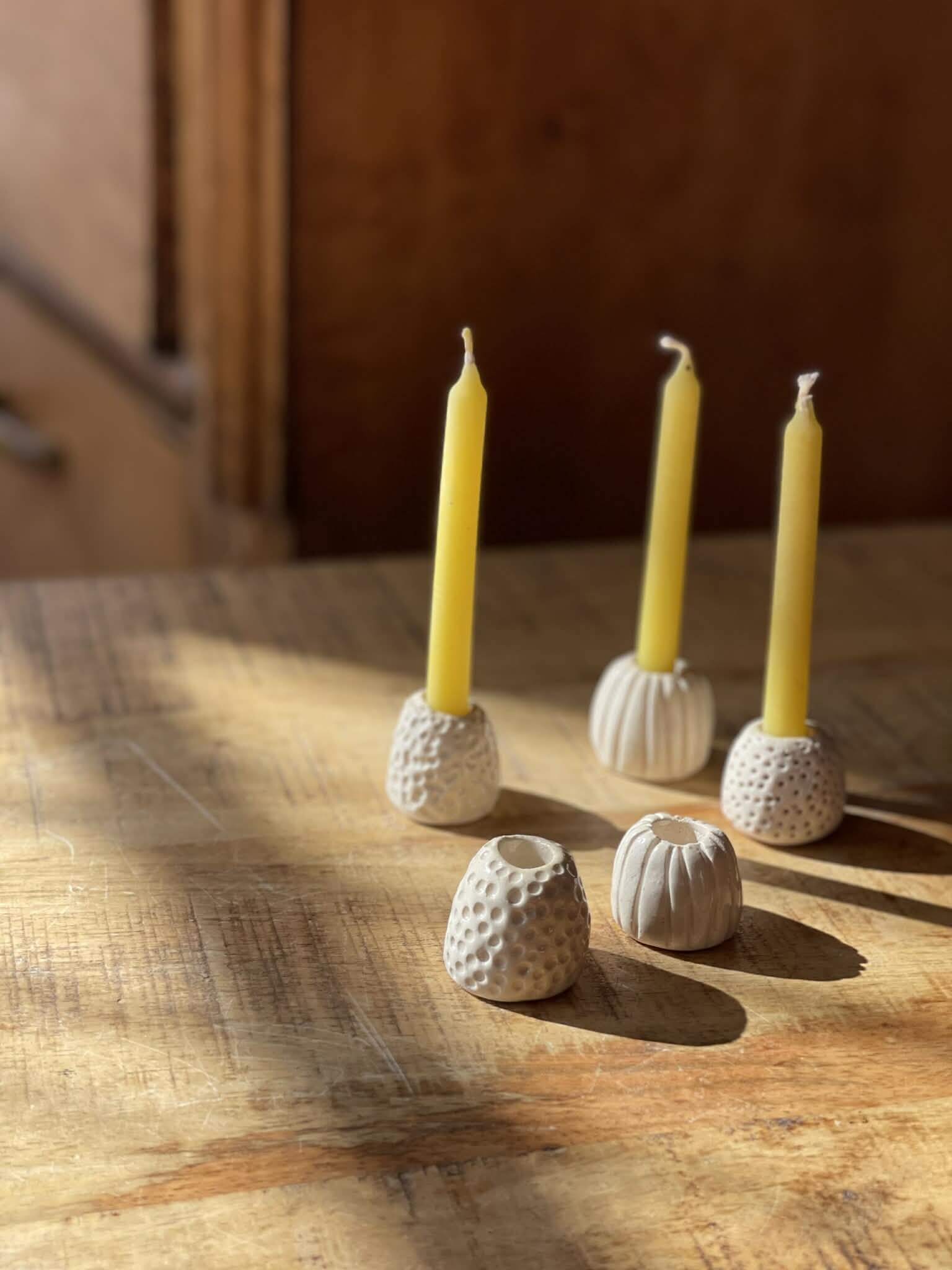 Rankų darbo keramikinė mini žvakidė, pritaikyta plonoms žvakėms.Žvakidės dydis – 3x3 cm.Bičių vaško žvakutes galima įsigyti atskirai mūsų e-parduotuvėje.
