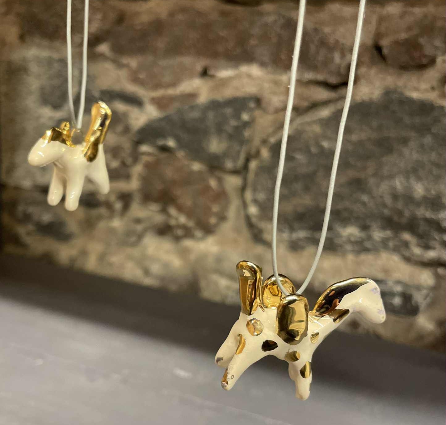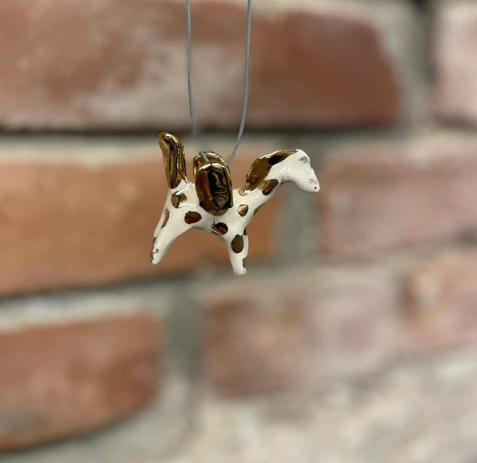 Rankų darbo išskirtinis pakabukas „Skraidantis arkliukas“ ant natūralios odos virvutės.Puoštas aukso liustra, sukurtas iš porceliano.Virvutės ilgį galima reguliuoti pagal poreikį.Rankų darbas.Keramikė Giedrė Nagreckienė