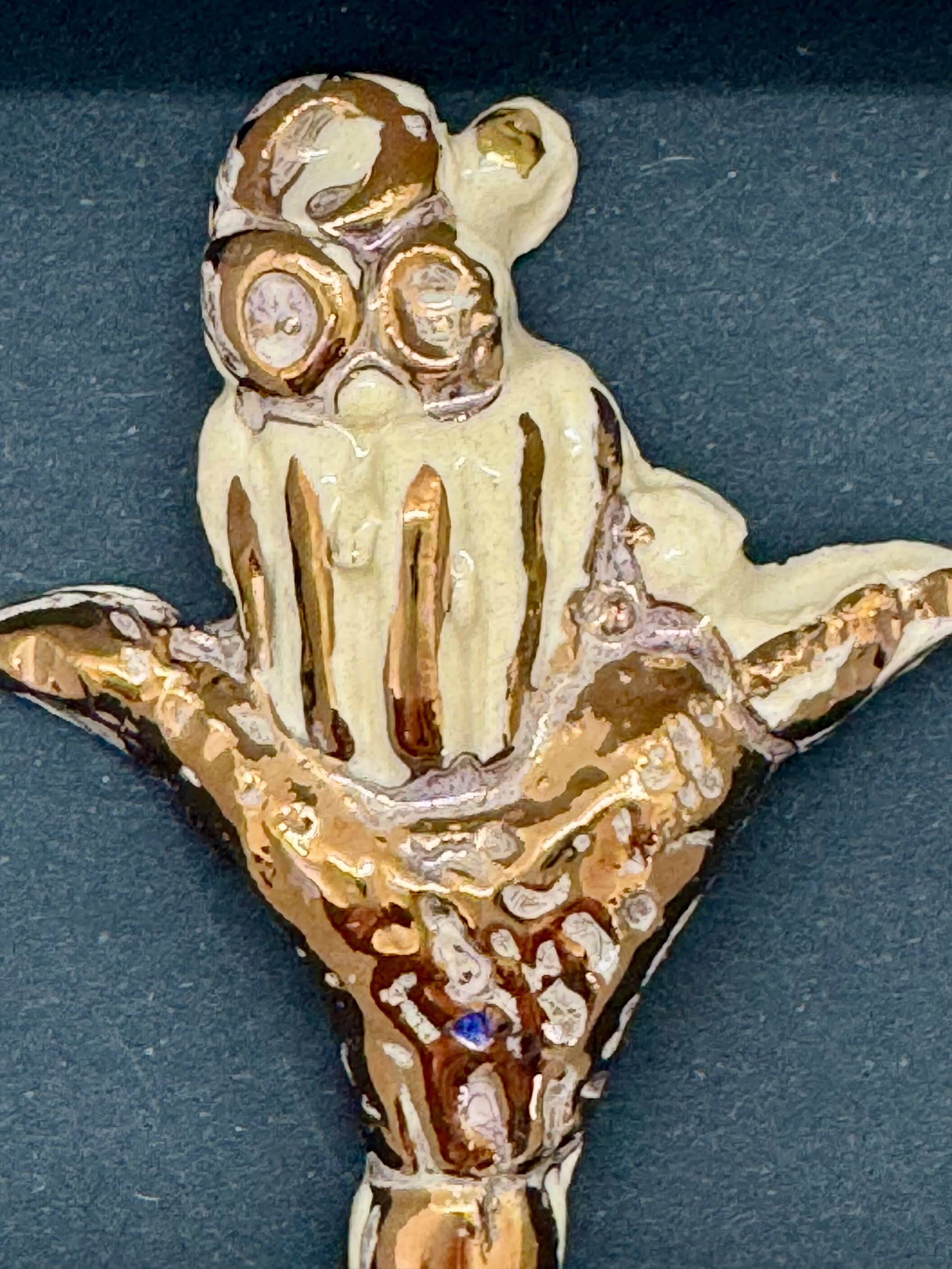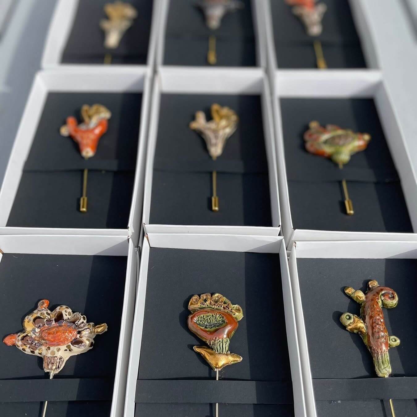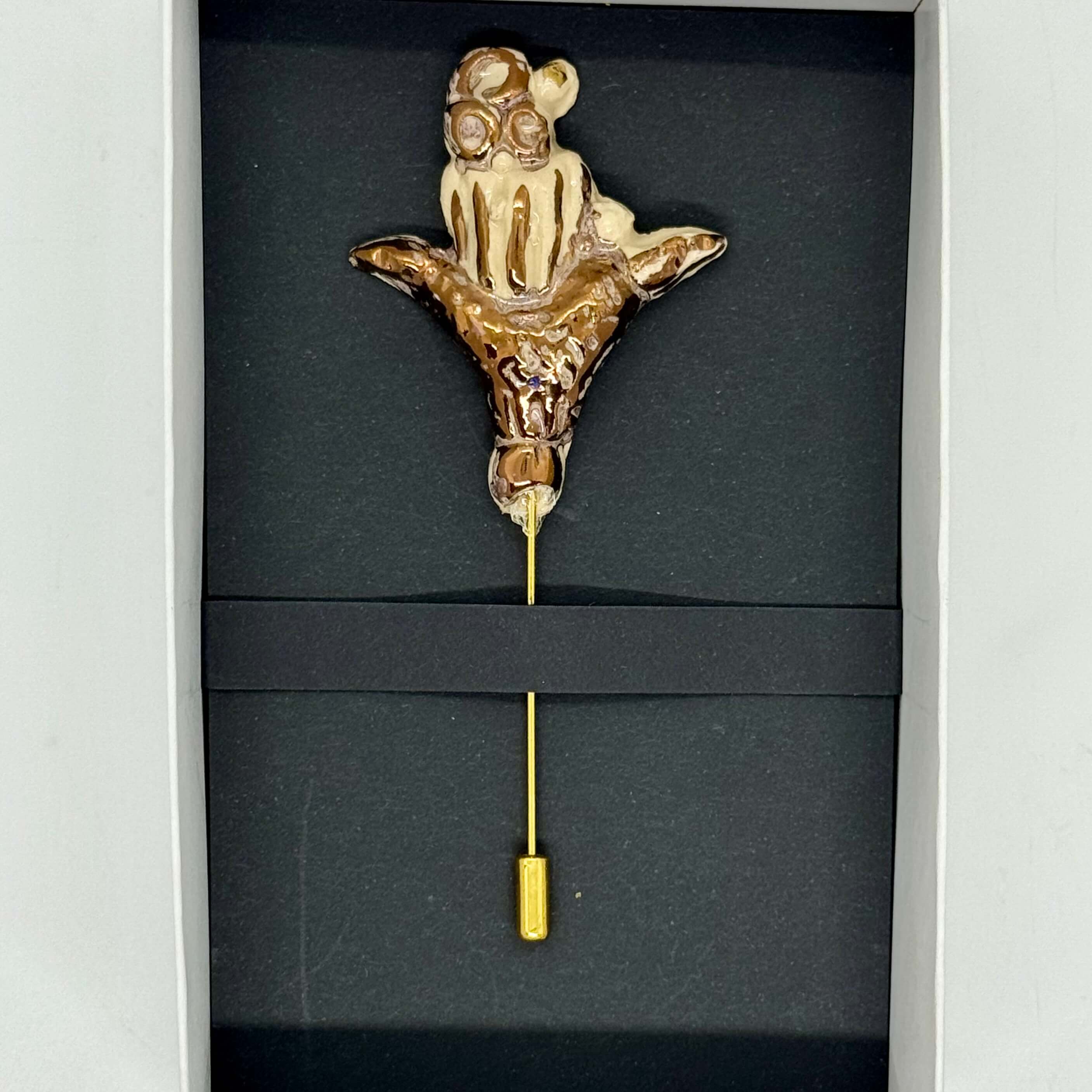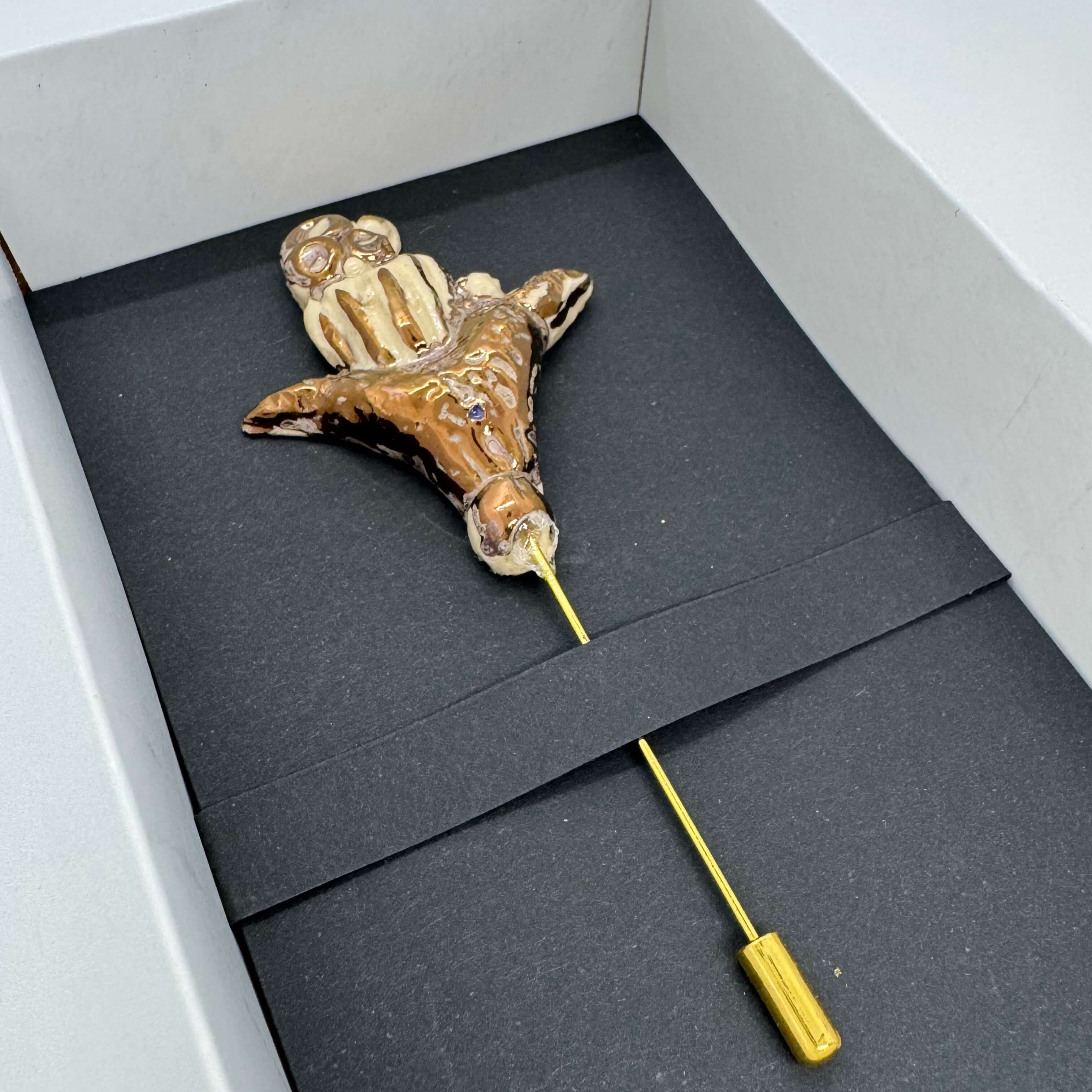 Keramikinė sagė - pin'as.Puikiai tiks į švarko, palto atvartą ar storą jaukų megztinį.Rankų darbas. Vienetinis egzempliorius.Preliminarus sagės dydis – 2x4 cm