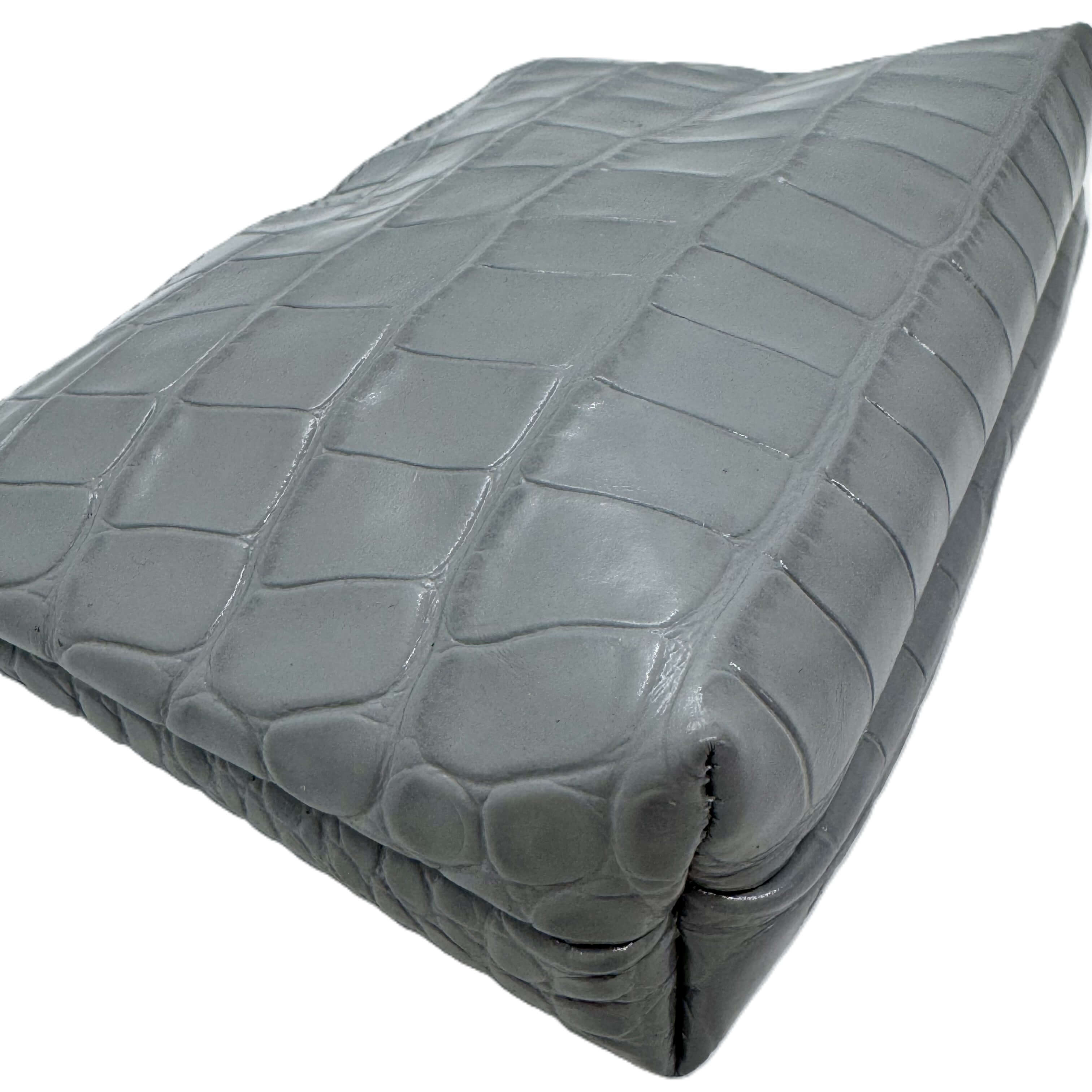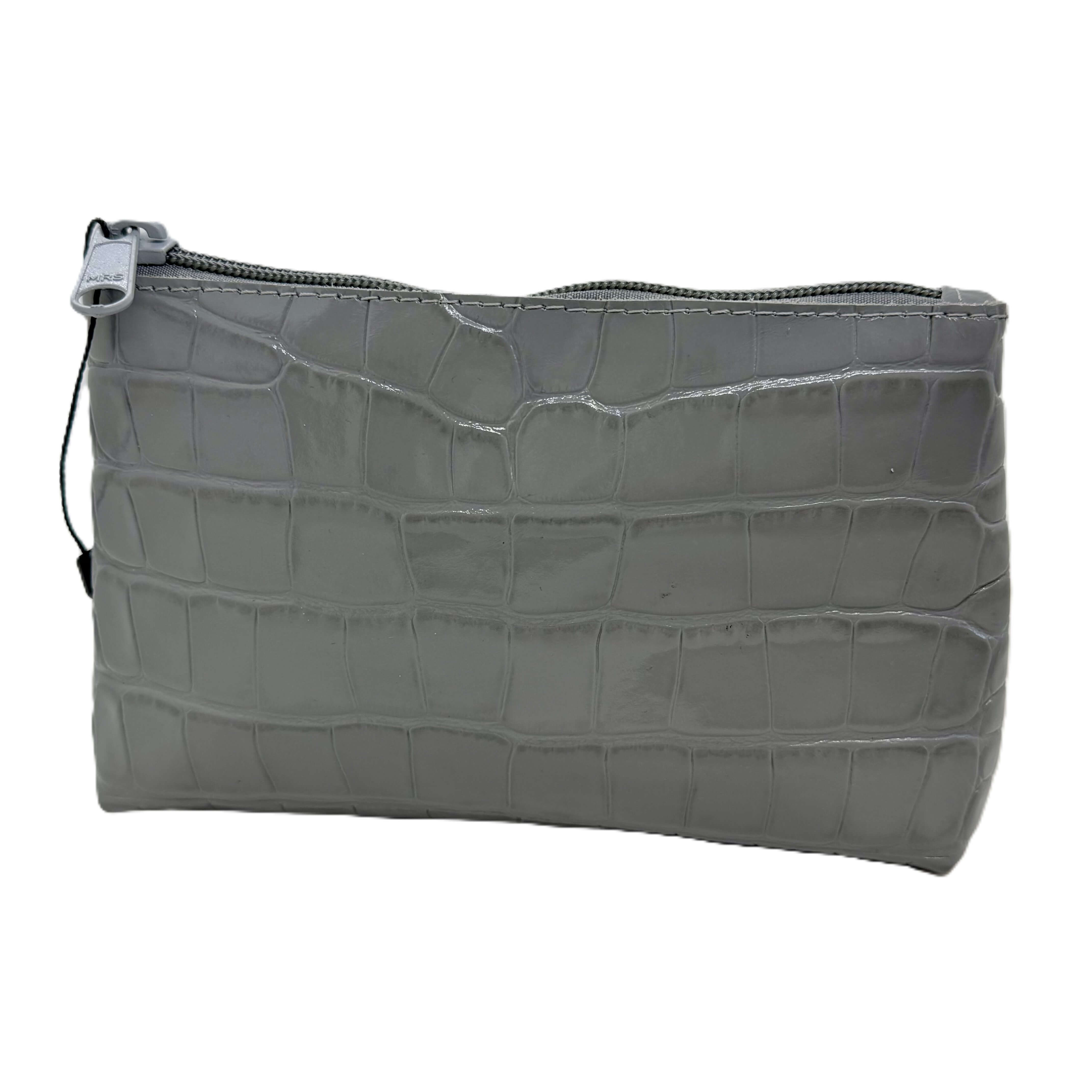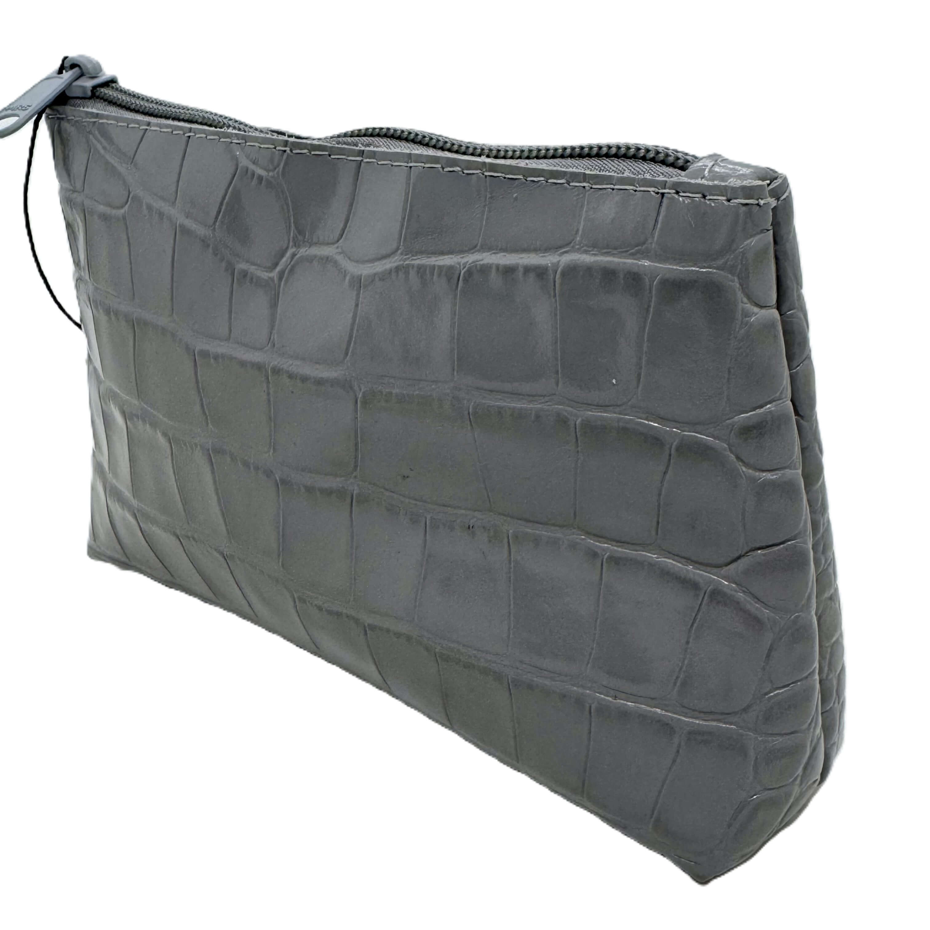 Natūralios odos kosmetinė, pagaminta iš natūralios odos.Prabangios pilkos odos, segama užtrauktuku.Kosmetinės dydis – 18x12x4 cm