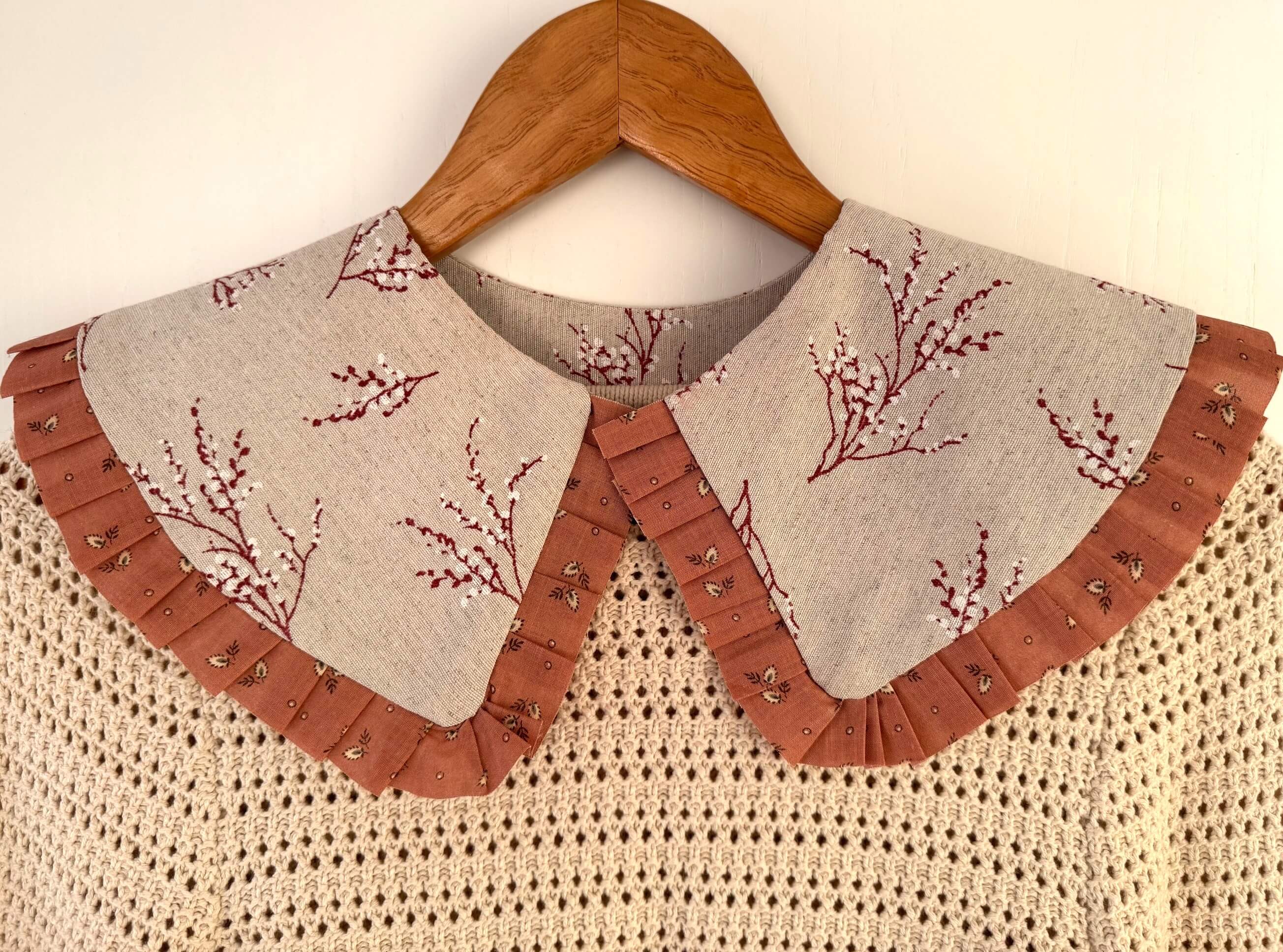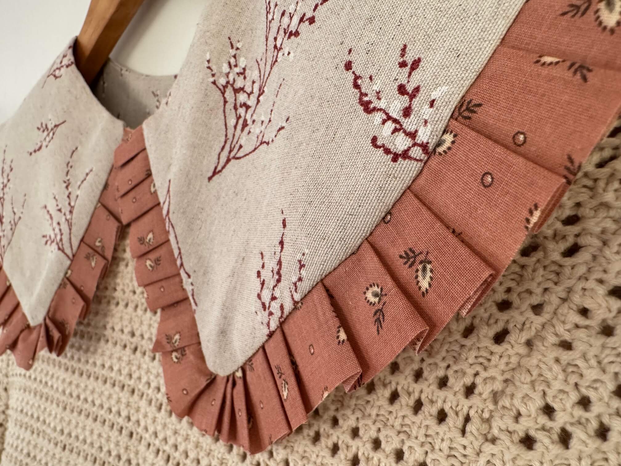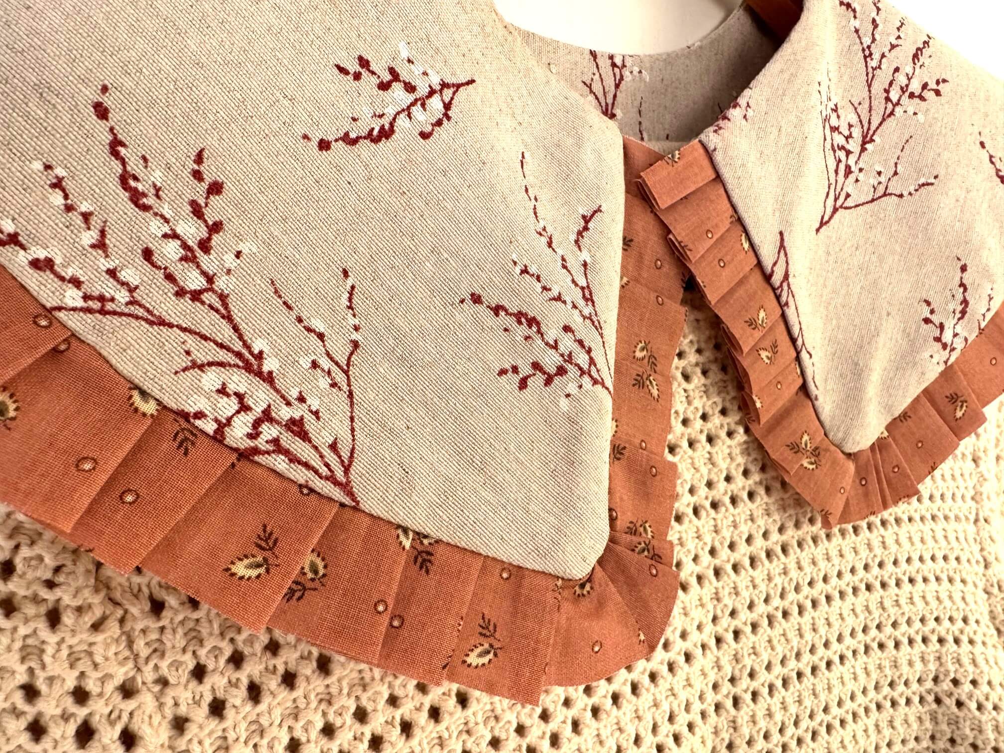 Rankų darbo žavi apykaklė. Puikiai derės prie vienspalvės suknelės, marškinių, džinsų, megztuko ir kitų derinių.Susegama sagute. Dailinta vintažinio kaspinėlio raukinukais. Dydis – universalus.