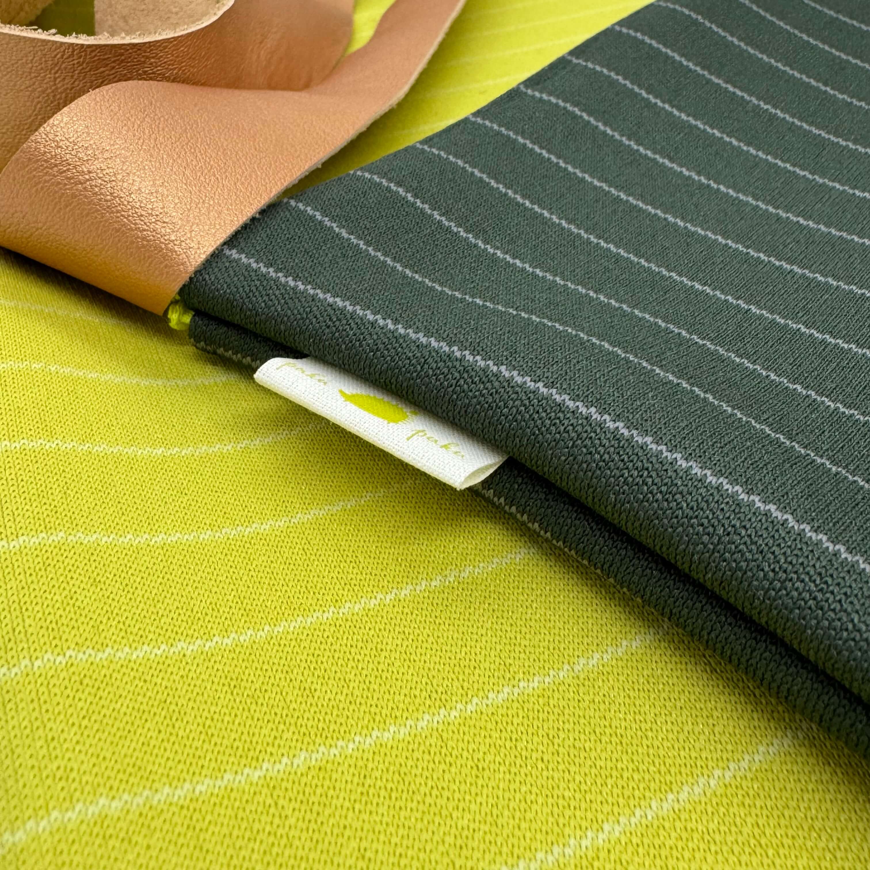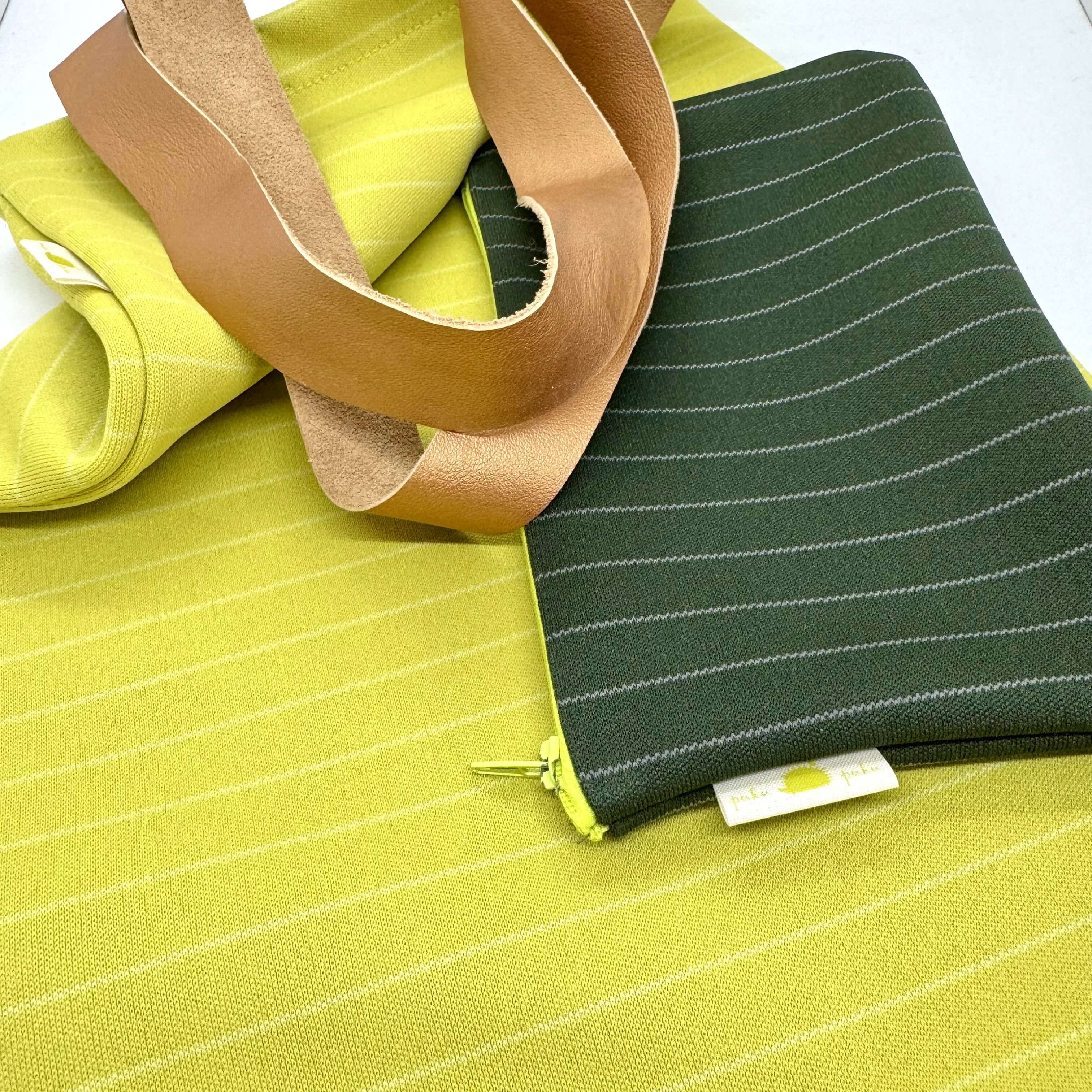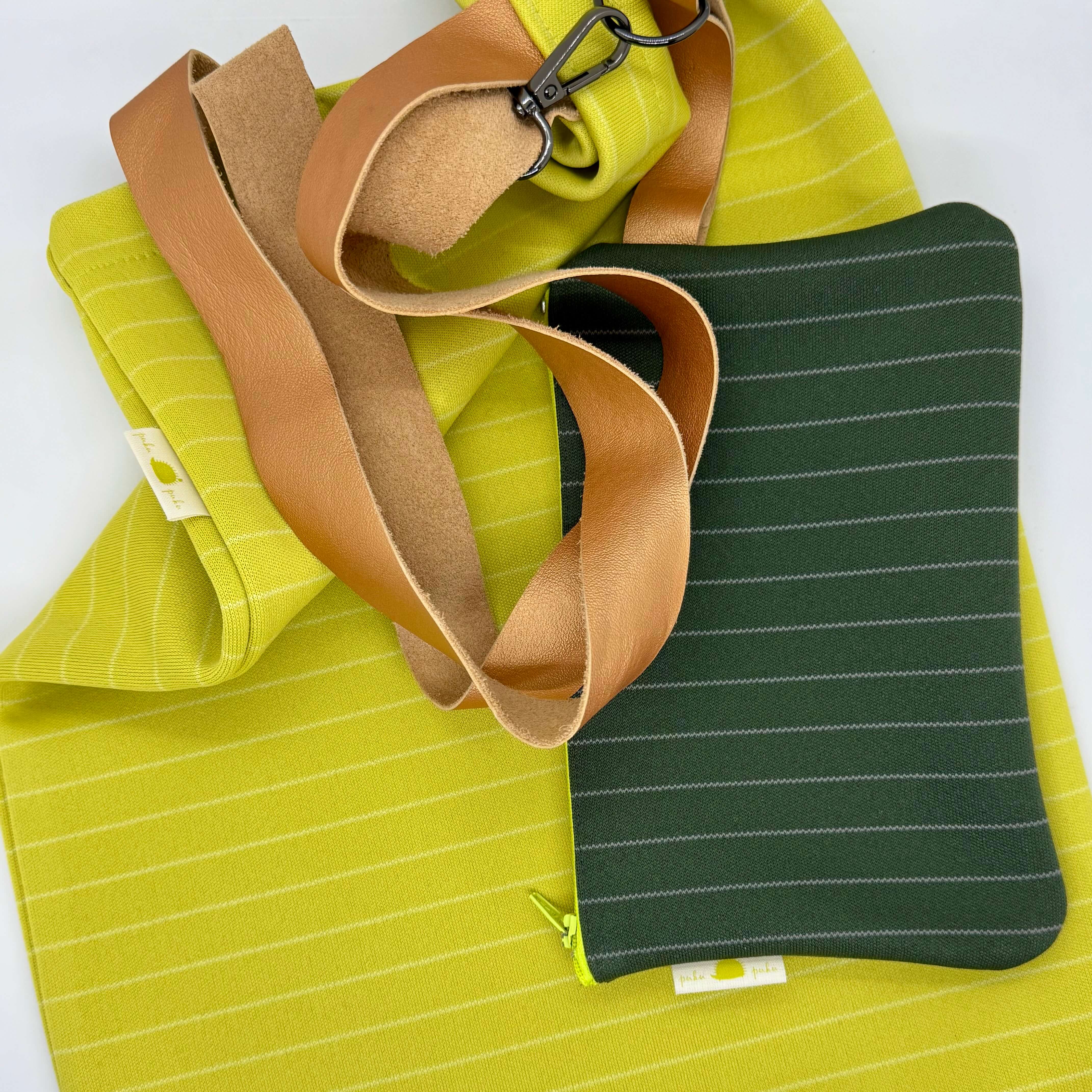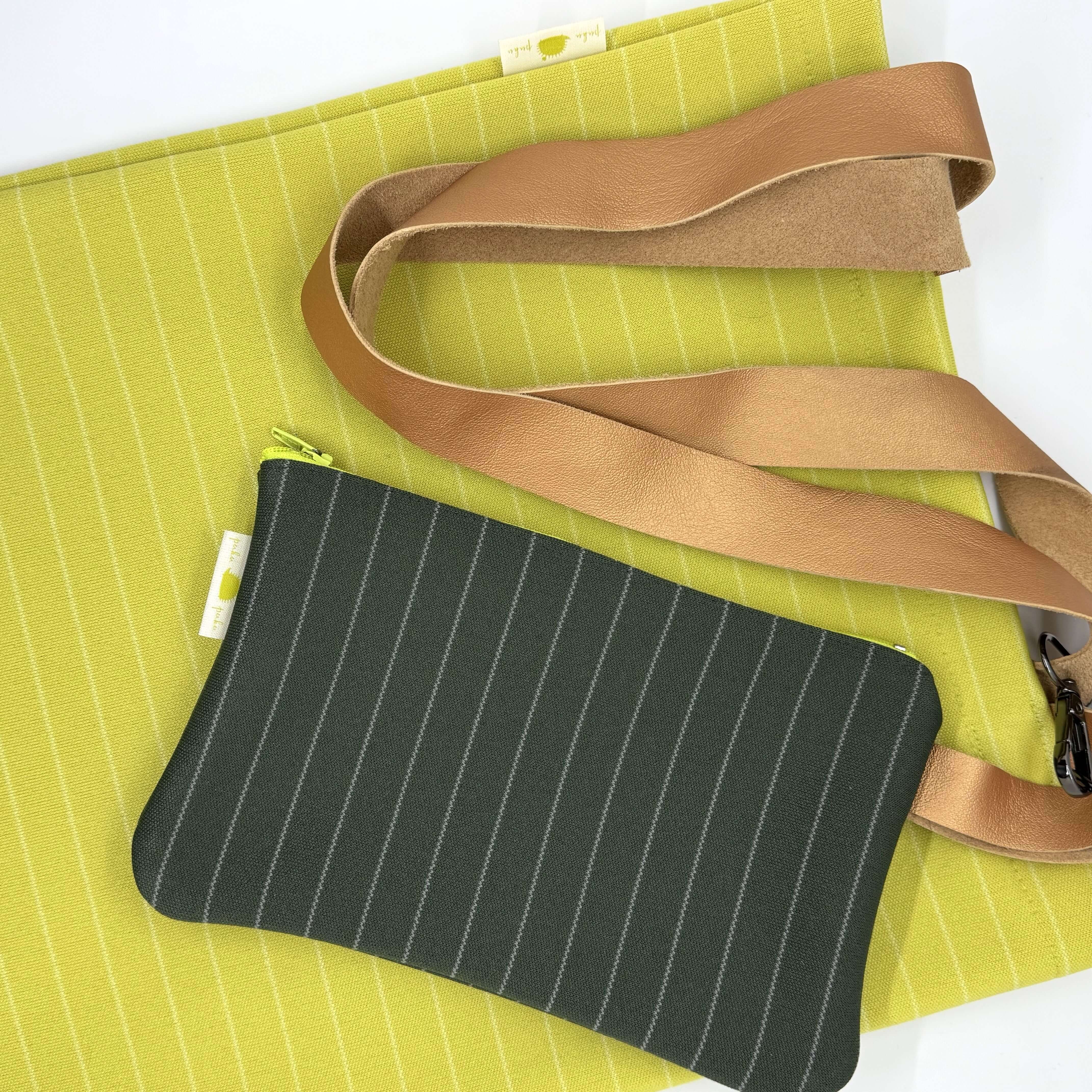 Tvirto audinio, plačiomis natūralios odos rankenomis. Metaliniu karabinu prisegama/nusegama piniginė raktams, kortelėms ir kitoms smulkmenoms.